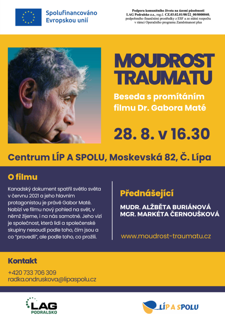 Zveme vás na srpnovou besedu s promítáním filmu : Moudrost traumatu od Dr. Gabora Maté. Dr. Maté – lékař, spisovatel a psychoterapeut se specializuje na studium závislostní terapie a léčbu závislých, je známý svými tezemi o poruchách pozornosti s hyperaktivitou, a vztahu mezi stresem, závislostí, imunitním systémem, chronickými nemocemi a psychickými traumaty.