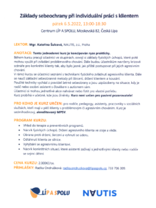 Během prakticky koncipovaného kurzu si účastníci osvojí techniky fyzického zvládnutí agresivního klienta a naučí se základní sebeobranné metody. Akreditace MPSV, cena 2.000Kč/os.