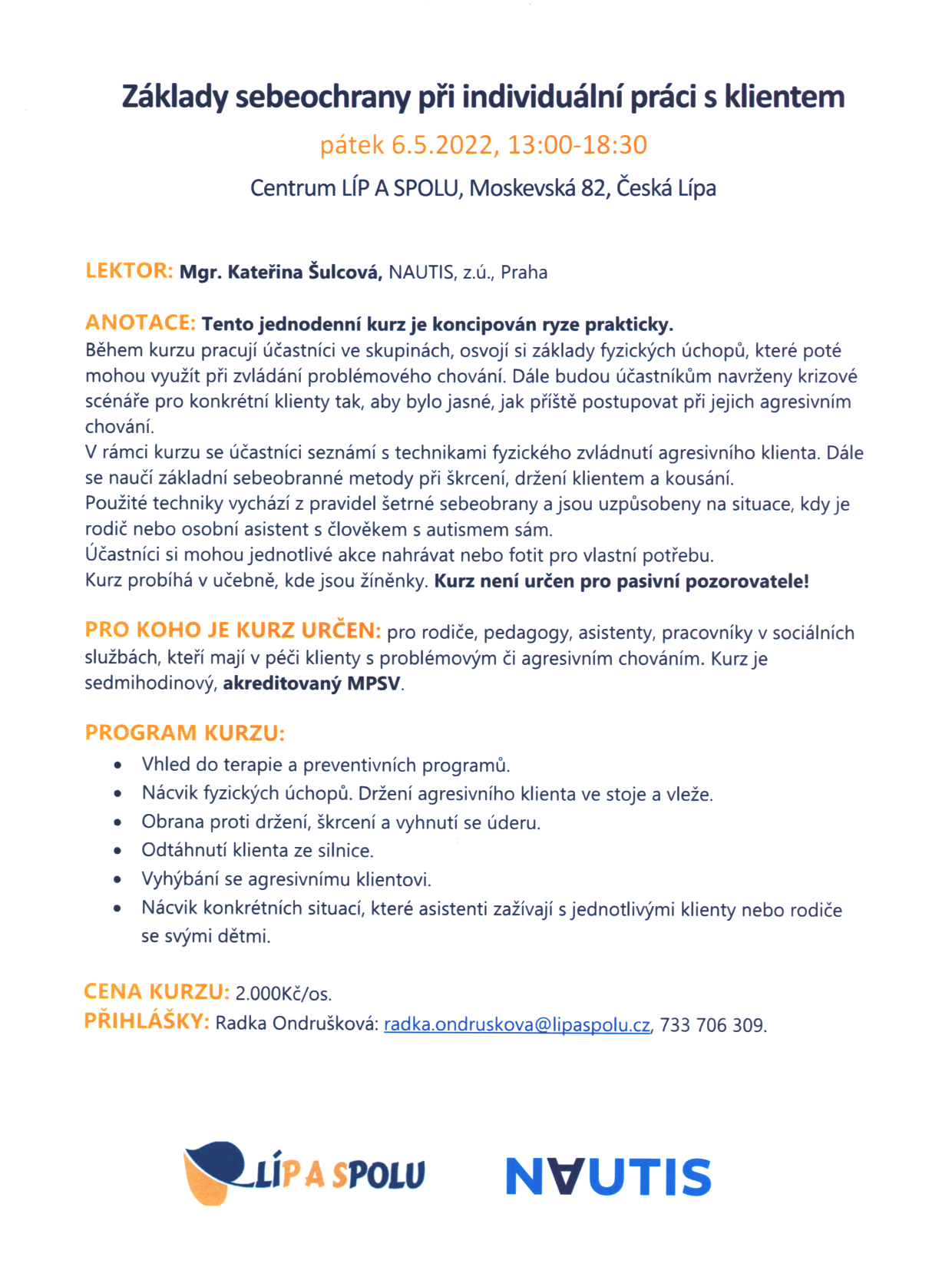 Akreditovaný kurz, přednášející Mgr. Kateřina Šulcová, NAUTIS, z.ú.